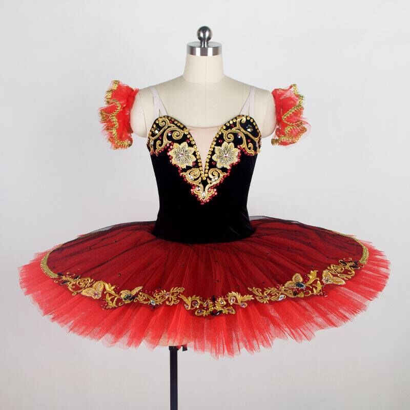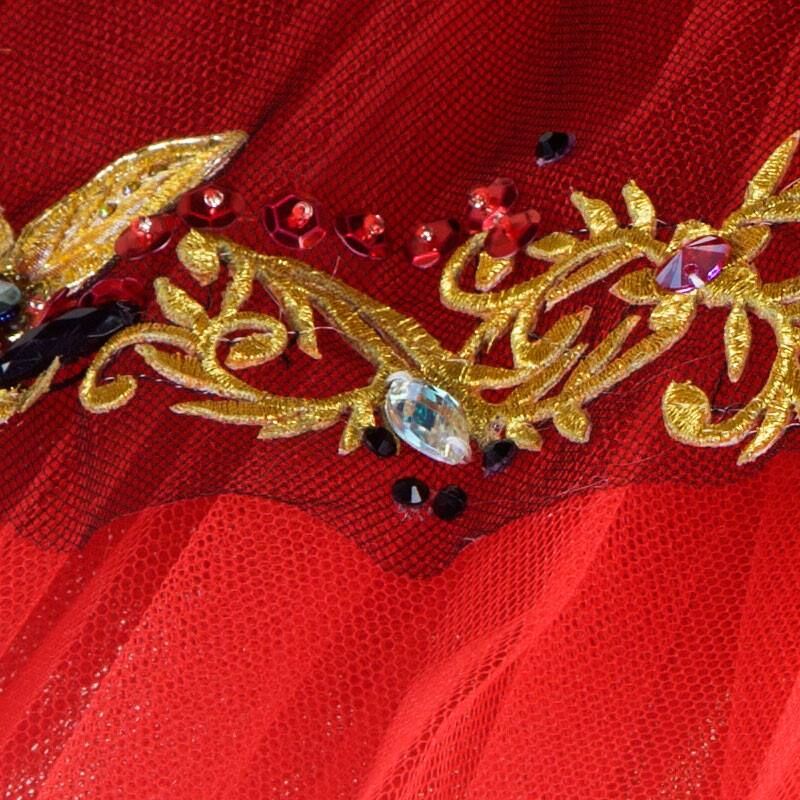 A spanish Don Quixote kitri tutu. This one piece red tutu has a lot of delicate sparkle and would be amazing for Paquita Variation 4 .
