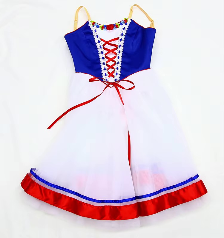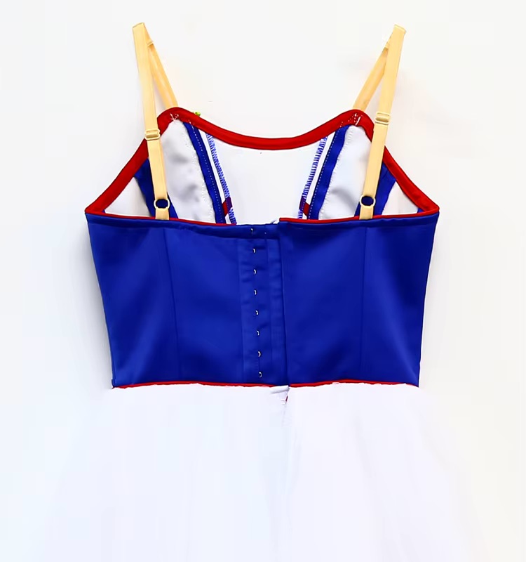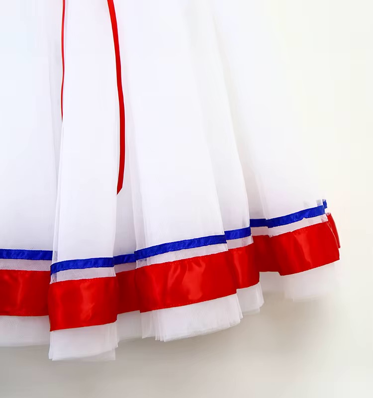 The skirt is crafted from layers of lightweight, floating white tulle that move effortlessly with every turn and jump. Falling to a graceful below-the-knee length, the Romantic-style silhouette offers beautiful flow on stage. The hem is decorated with vibrant red and blue satin ribbons, proudly echoing the colors of the French flag for authentic Flames of Paris character styling.