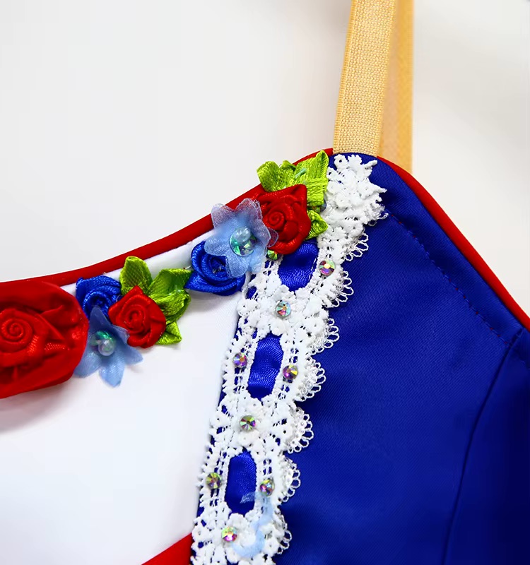 The bodice features a deep royal-blue finish, shaped for a flattering fit and enhanced with a delicate white inset reminiscent of a French peasant blouse. A striking criss-cross ribbon design adorns the center front, framed by intricate lace trim and floral appliqués that add a touch of romantic sophistication. Soft gold shoulder straps provide secure support while maintaining an elegant line.
