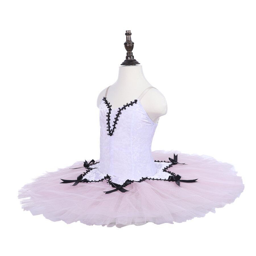 This tutu is made from white crushed velvet and pale pink tulle, there are 7 layers of stiff tulle for adults and 5 for children. Sits as a perfect pancake. The tutu has black trim and satin bows. Would sit a doll variation from the Nutcracker.